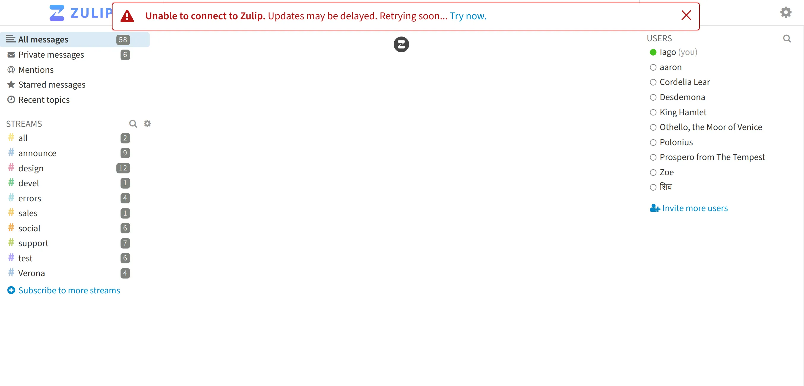 This malfunctioning interface did not display messages, but did display sensitive metadata, including stream names, names of other users in the organization, unread counts, etc. Users in this state could click around to see additional metadata, like topic names, email addresses, and settings. Attempts to fetch messages or change state, like sending messages, would fail with authentication errors.