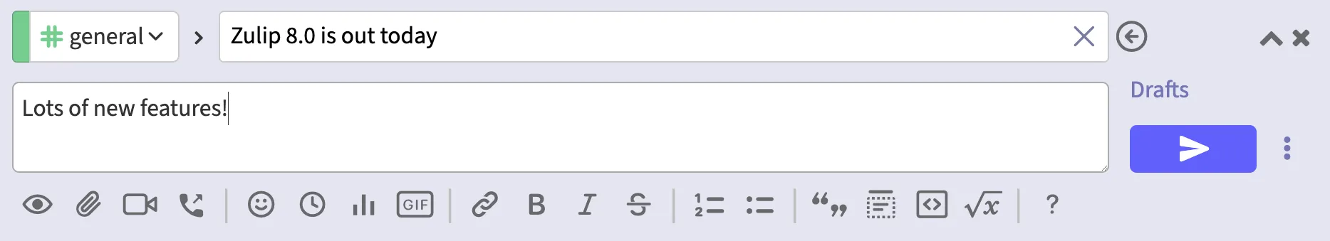 The major features and improvements described below are the tip of the iceberg of all the work that goes into a major Zulip release. We dedicate a lot of attention to the little things that help make Zulip a joy to use, such as fine-tuning common interactions, investigating and fixing hundreds of minor bugs, clarifying the UI and the API, etc. Even if you aren’t looking for new features, each major Zulip Server release offers a significantly better overall experience.