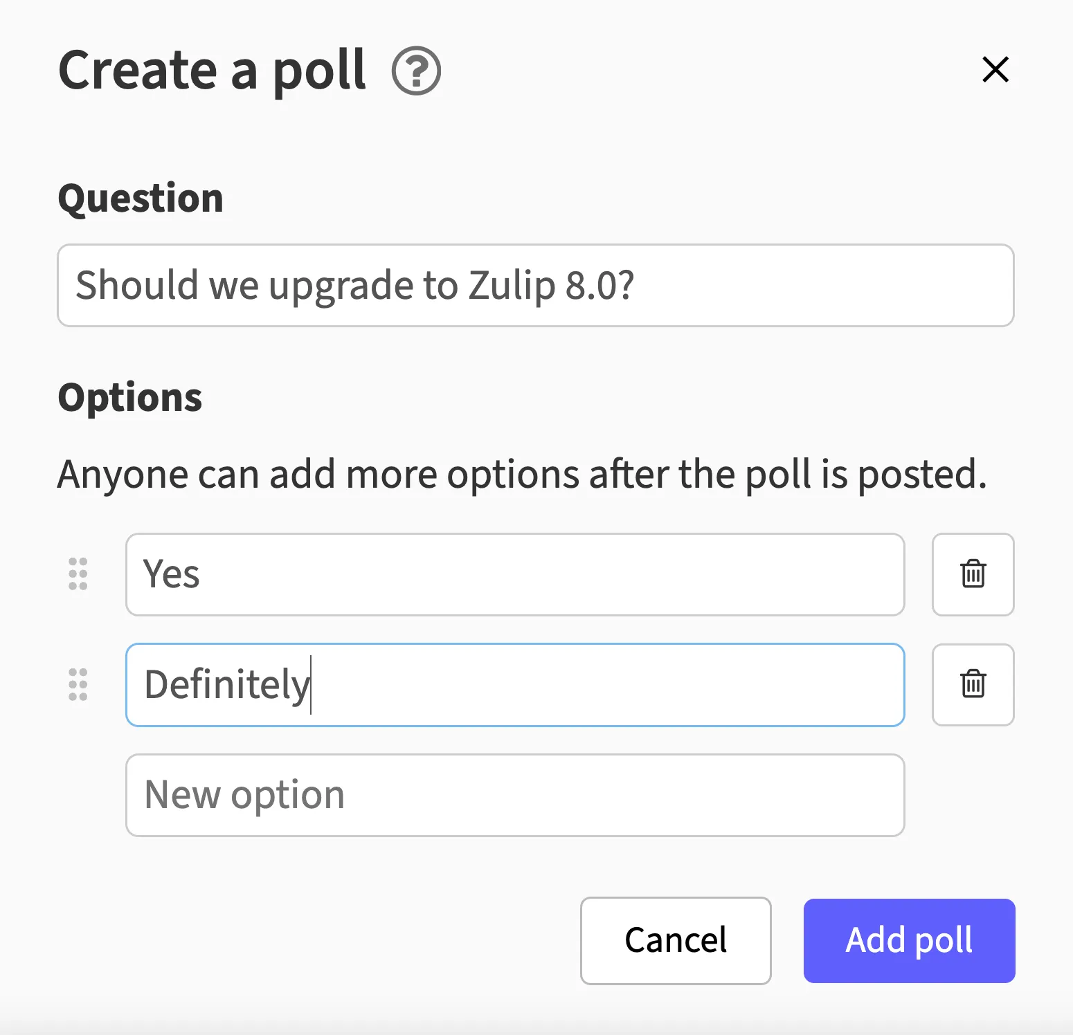 A new poll UI makes it easy to send a poll without worrying about formatting.