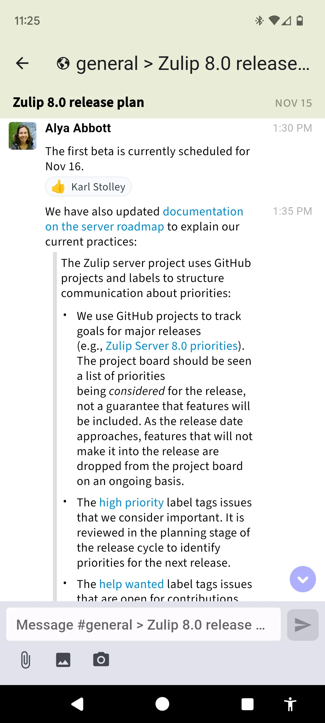 In early 2024, we’ll announce on the Zulip blog a beta version that has all of Zulip’s key features, so that you can try it out and see the new smoother experience for yourself. In the months after that, we’ll roll out the new app for everyone as the next version of the official Zulip mobile apps on both iOS and Android.