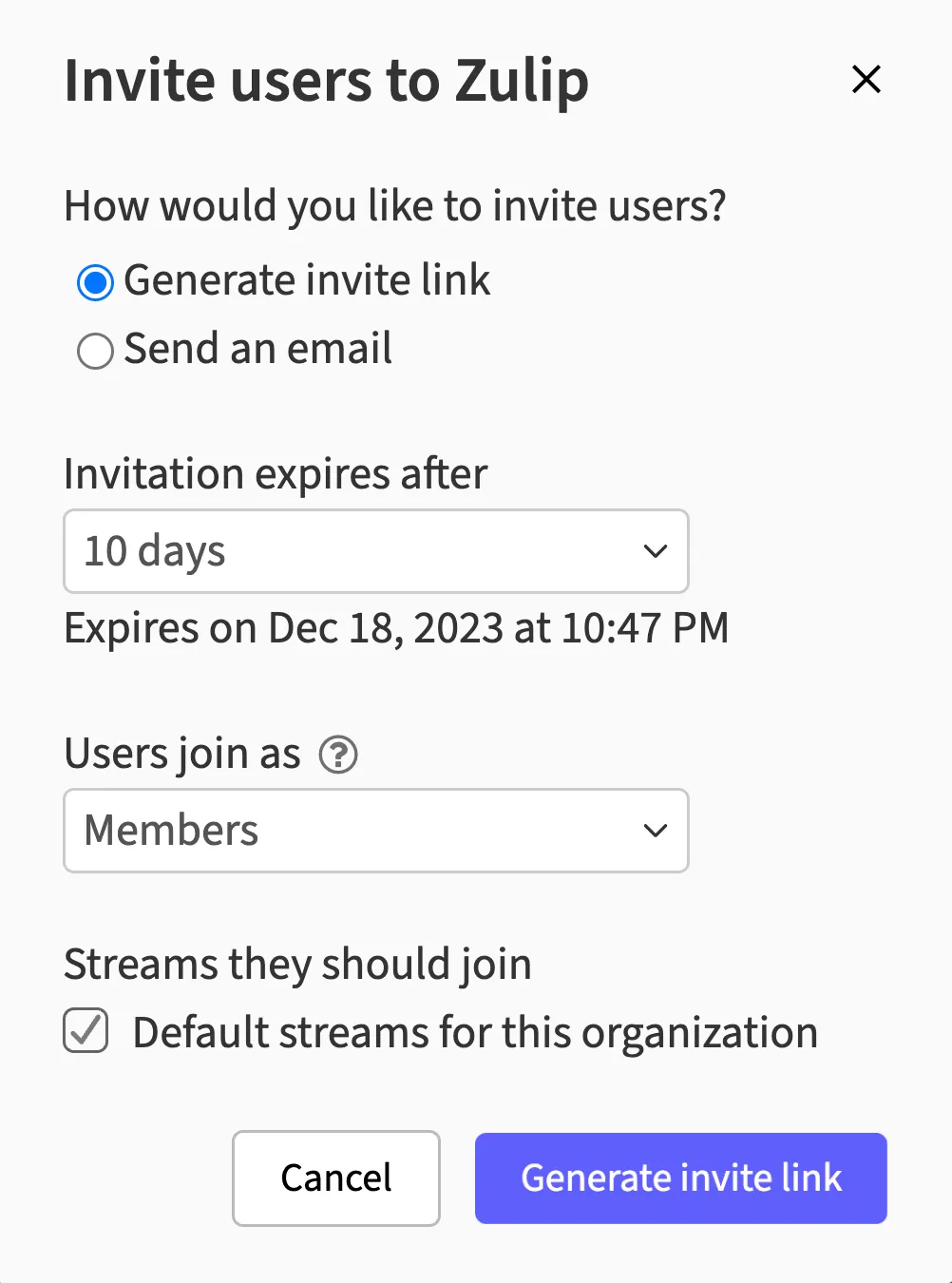 - The UI for inviting new users has been redesigned to make invitations easier to configure. Also, you can now independently configure permissions for who is allowed to generate invitation links vs. sending invitation emails.