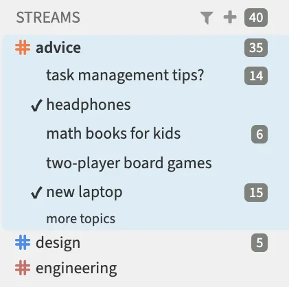 - You can now follow topics you are interested in. It’s easy to prioritize catching up on followed topics using configurable notifications, filters in the inbox and recent conversations views, and a dedicated keyboard shortcut. With the default settings, you will automatically follow the topics you start or get mentioned in.