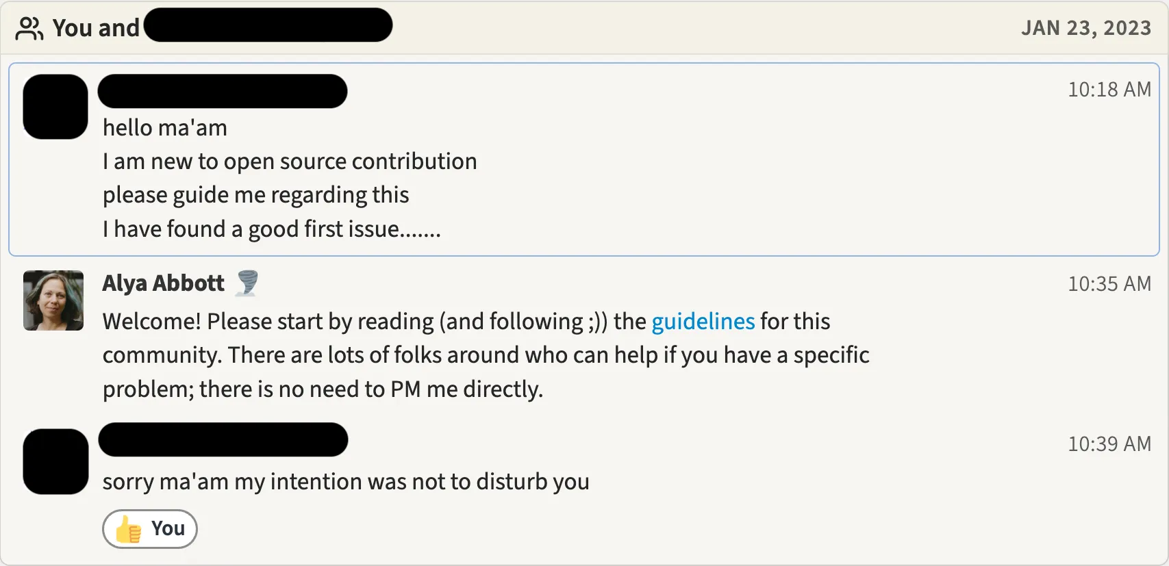 Nevertheless, every few days, I get DMs like these from new contributors 🤦‍♀️ :