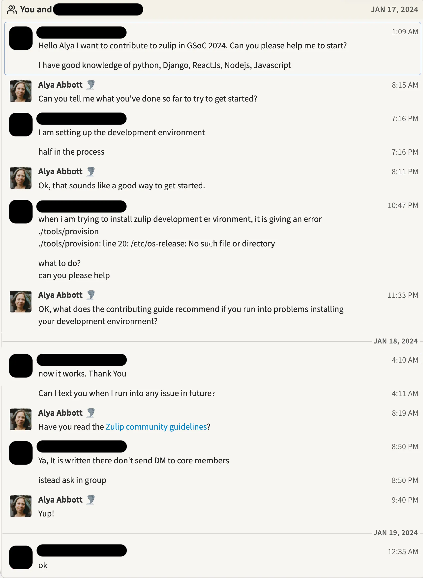 Alya Abbott A year ago, I figured out a better way to manage new contributors who are failing to follow the guidelines for the Zulip open-source community, and enjoy it more.