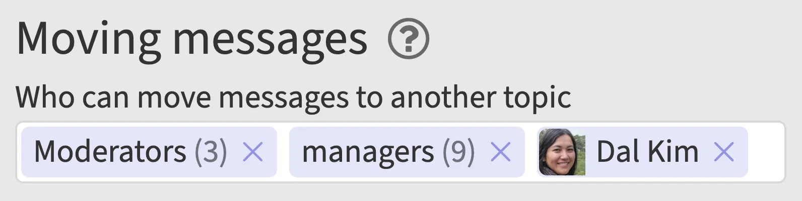 roles (e.g., Moderators), groups, and