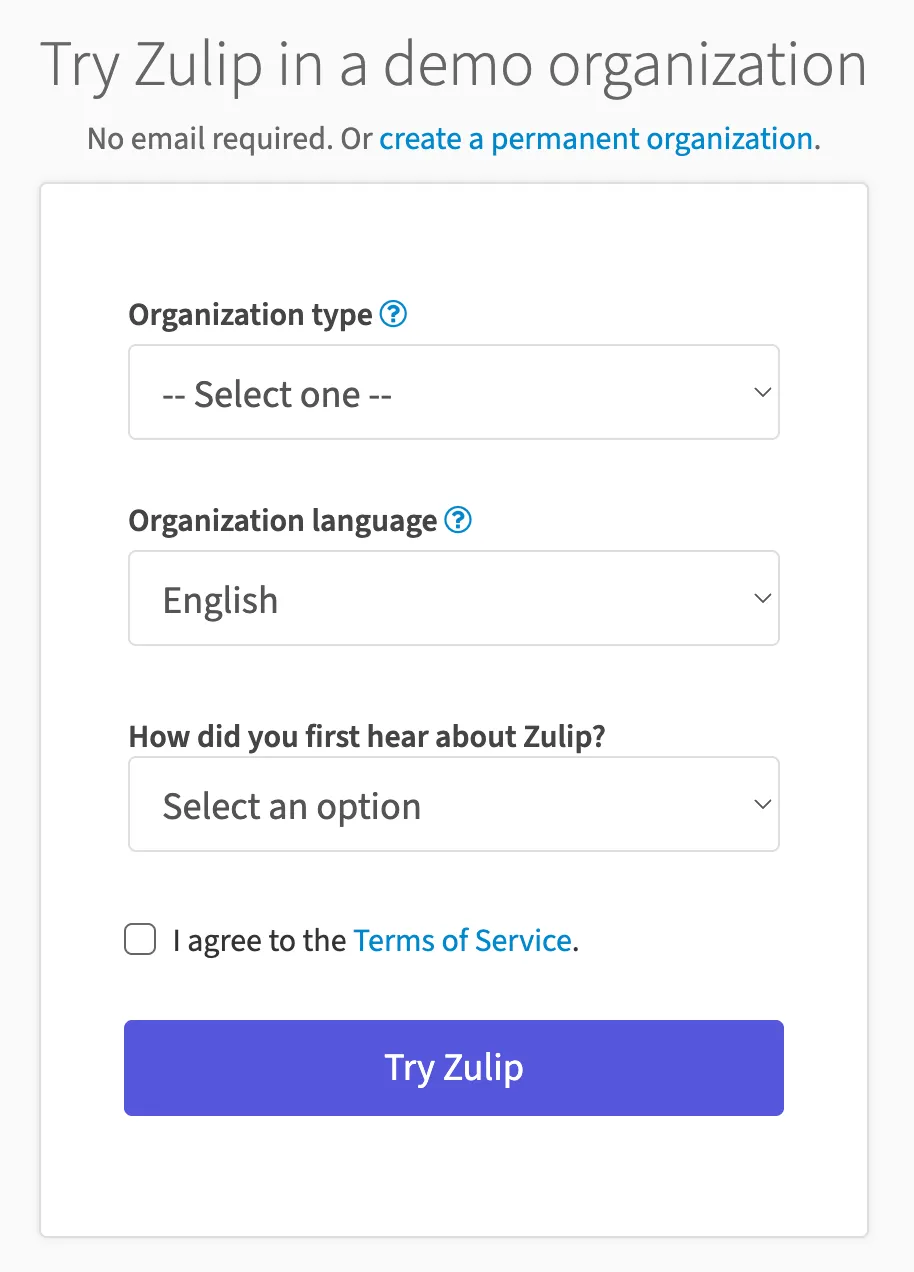 As part of evaluating Zulip, you can now create a demo organization in Zulip Cloud without providing your email or any other identifying information. It’s a great way to explore the app, whether you’re considering Zulip Cloud or a self-hosted deployment. Demo organizations are automatically deleted after 30 days, but can be converted into a regular organization if desired.